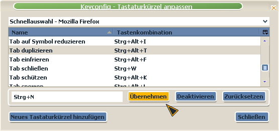 schade, dann weiss ich auch ned weiter, bei mir war "Tab duplizieren" da, und sieht (nach doppelklicken) so aus ... http://forum.geizhals.at/files/25842...tab-dupliz.jpg Aber vielleicht reicht's eh, den Schlüssel neu anzulegen, also per "Neues Tastaturkürzel hinzufügen" und dann eben ... Code: