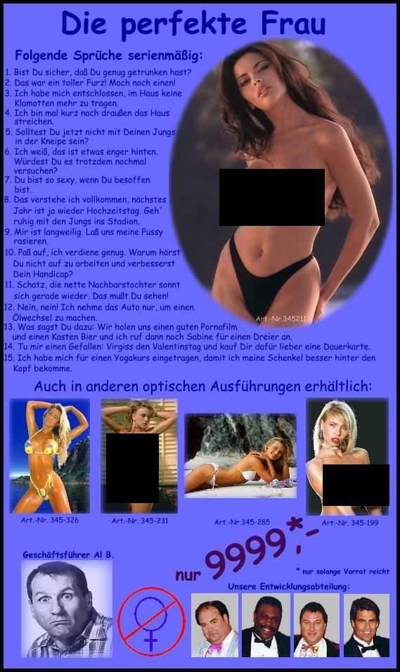 Meine Traumfrau hat sich mit 18 die Brüste auf Doppel-D machen lassen, geht jeden Tag ins Solarium, läßt sich jeden Tag ein neues Tatoo machen, hat jede Woche neue Fingernägel in den buntesten Farben, kann nicht kochen, kann nicht Autofahren obwohl Führerschein, färbt sich die Haare wasserstoffblond, kann kaum einen zusammenhängenden Satz formulieren, geht täglich 12 Stunden shoppen, liebt Schlagermusik, hat auch im Intimbereich Piercings, rasiert sich die Vulva, hatte mit 15 ihr erstes Kind, lebt vom Staat, will wie Paris Hilton sein, kann und weiß Alles, will von Allen geliebt werden, geht gerne fremd, lungert täglich in Discos herum, trinkt gerne Gummibärli und Champagner, hält BMW für ein Waschmittel, findet Stringtangas sexy, vergißt die Pille, verSIMST im Monat 3000.- Euro, sieht gerne Sex and the City, schluckt nicht, will kein Facial, steht auf südländische Rammler, hat mit 12 Schule und Leben abgebrochen!