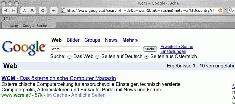 .. hab es gerade selber unter "Panther" ausprobiert, du musst dich als Admin anmelden, das Tool hab ich dann ins Verzeichnis Programme.. Dienstprogramme gezogen.. nach dem ersten Aufruf musst du die Safari Paketdatei anwählen, wenn du nun das Tool startest kannst du Google Austria wählen und auf Anwenden gehen, im Safari steht dir dann die Google Seite mit dem Zusatz "Seiten aus Österreich" zur Verfügung, siehe Screenshot.. .. Tool ist in Deutsch, wenn du "Safari Enhancer" nicht mehr brauchst kannst du alles löschen, die Einstellung in Google bleibt trotzdem.. http://666kb.com/i/akp2t2kpmjmul2u0b.jpg |