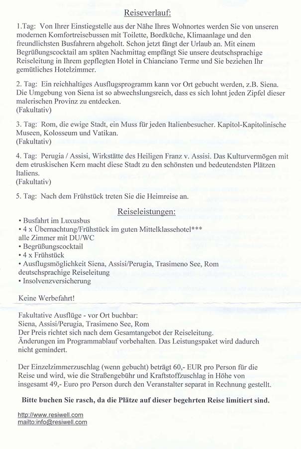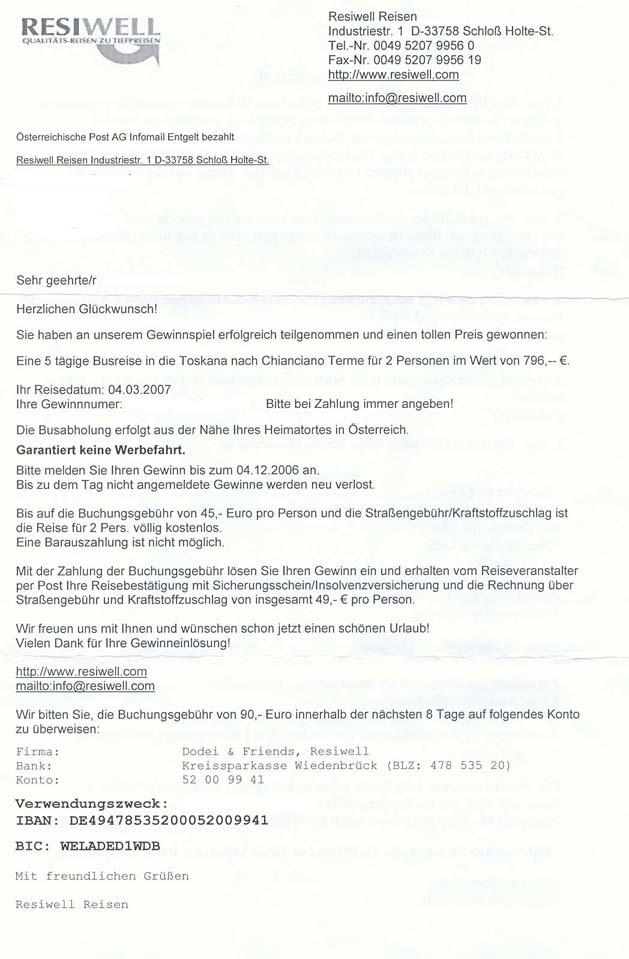 Aber allein die Eingabe von Resiwell in Google bringt als ersten HIT (unter vielen weiteren ähnlichen) einen Link zur AK Niederösterreich, wo vor solchen Reisen gewarnt wird. http://noe.arbeiterkammer.at/www-588-IP-26080.html Bitte lese dort mal nach, schmeiss den Gewinnbrief weg und lad Deine Mutter auf einen Punsch am Christkindlmarkt ein - das wird sie mehr freuen .... Ciao Oliver