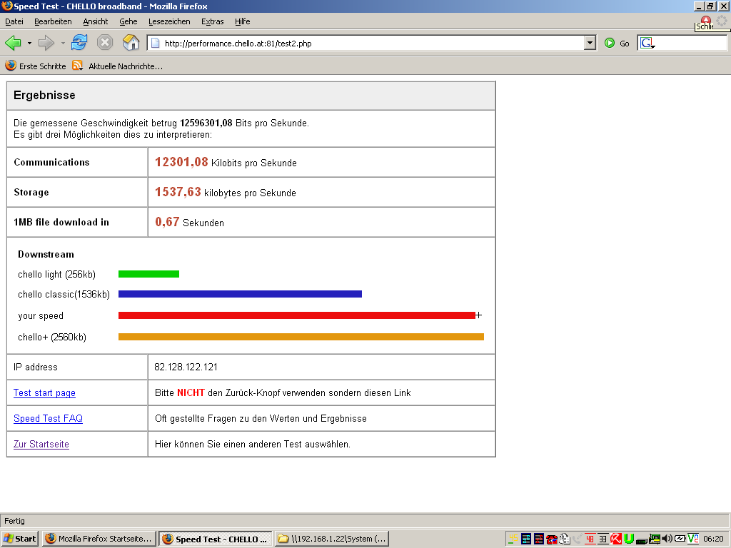 Hab mir extreme geordert, hatte vorher plus, und jetzt folgende werte: Communications 3584,60 Kilobits pro Sekunde Storage 448,08 kilobytes pro Sekunde 1MB file download in 2,29 Sekunden Bis auf den Upload ist alles gleich wie vorher... Laut 3 chello technikern hab ich aber 12mbit eingetragen... 2 Techniker meinten "ist eh eingetragen" - meine antwort war "läuft aber nicht so wies soll" - antwort drauf war dann "doch" naja, der 3te hat dann gmeint ich soll was runterladen @ chello, naja, wie ich 300kb/s gsagt hab, is er stutzig gwordn, hat vor ner woche gemeint, er leitets weiter, und mich ruft irgendwer an, bis heut nix Find ich echt leiwand.. weiß vielleicht wer worans liegen kann? Aber naja, wird mir wohl niemand helfen können, ausser upc... Morgen kommt eh a techniker, weils priority ned geht, aber ob sich der auch mit chello auskennt ^^ mfg danke |