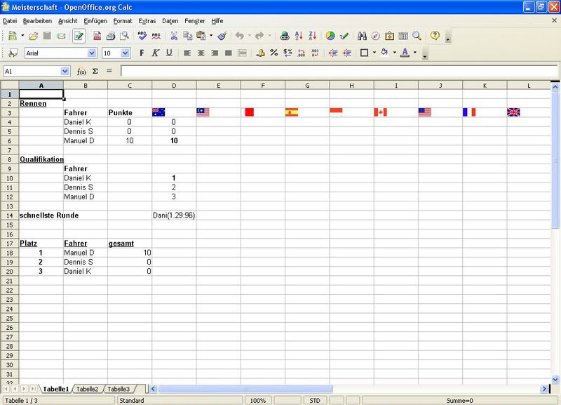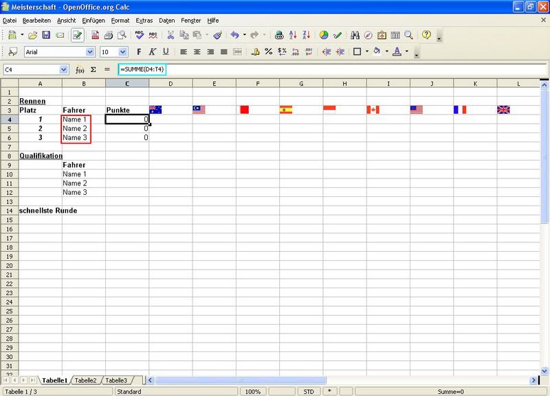 vorneweg: ich benutze OpenOffice und arbeite sozusagen zum ersten mal mit Excel bzw Calc(name bei OpenOffice). Zwei Freunde und ich haben uns nun überlegt die F1 Wm nachzufahren. Wir haben F1 2002 von Ea Sports und da wir immer nur die gleichen 2 strecken fahren, fanden wir die idee ganz gut ![]() Ich habe nun eine Tabelle erstellt. ![]() Ich habe es hinbekommen das die Spalten (siehe türkiesen Bereich) addiert werden wenn man die Punkte einträgt... Allerdings kann es ja sein, dass sich die Gesamtplatzierung nach einem Rennen ändert weshalb die Reihenfolge ja nicht mehr stimmt (siehe rotes Kästchen und links daneben)... Meine Frage ist nun ob es eine Möglichkeit gibt, die gesamtpunktzahl von groß nach klein und somit von oben nach unten AUTOMATISCH zu sortieren... und das die Namen dann mitwechseln, wobei man das ja auch selber machen kann... ich könnte mir vorstellen das es dann probleme mit der formel (türkis) geben könnte weil diese ja von den spalten abhängig ist... Ich hoffe Ihr versteht was ich meine ![]() Vielen Dank im Vorraus ![]() Manu ![]()
