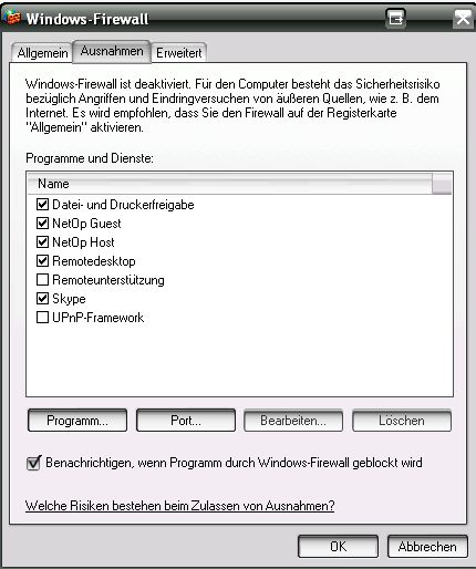 wäre nett, wenn mir jemand bei einem kleinen Problem weiterhelfen könnte: Wir haben hier im Büro 2 PC, ein älterer mit Windows2000 und ein neuerer mit WindowsXP. Beide hängen an einem gemeinsamen Internet-Router. Auf diese Weise kann ich auch Dateien zwischen den beiden PC hin und her schieben. Nun das Problem: Sobald ich beim WindowsXP-PC die windows-eigene Firewall aktiviere, kann ich nicht mehr vom anderen PC aus darauf zugreifen. Jedes mal, wenn ich also Dateien hinüber schieben möchte, muss ich vorübergehend die Firewall abschalten. Gibts da nicht eine bessere (Einstell)möglichkeit? Danke & Grüße, Chris |