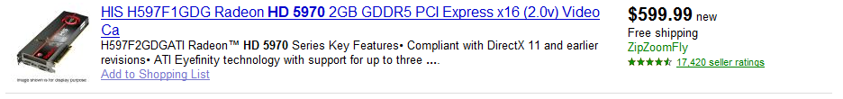 Während die ersten DirectX-11-Grafikkarten von NVIDIA noch immer auf sich warten lassen, werkelt Konkurrent AMD schon fleißig am nächsten Streich. Bekanntlich soll noch in dieser Woche die Doppel-GPU-Karte ATI Radeon HD 5970 auf den Markt kommen. Während wir in den letzten Tagen schon die vermeintlich finalen Spezifikationen enthüllen konnten (wir berichteten), scheint man nun auch den offiziellen Preis zu kennen. Demnach soll das kommende Flaggschiff für rund 599 US-Dollar gehandelt werden, zumindest wurde jetzt ein HIS-Modell für 599,99 US-Dollar gelistet. Um der gewaltigen Abwärme der beiden RV870-Chips, welche jeweils über 1600 Streamprozessoren (320 5D) und 80 TMUs sowie 32 Rasterendstufen beherbergen, Herr zu werden, musste die US-Amerikanische Chipschmiede die Taktfrequenzen im Vergleich zu einer ATI Radeon HD 5870 etwas absenken. So soll "Hemlock" mit 725 bzw. 1000 MHz auskommen. Dafür soll die Thermal Design Power (TDP) mit 294 Watt nicht die magische 300-Watt-Marke übersteigen und somit etwa 110 Watt mehr aus dem Netzteil ziehen, als noch die Single-GPU-Lösung mit einer TDP von 188 Watt.