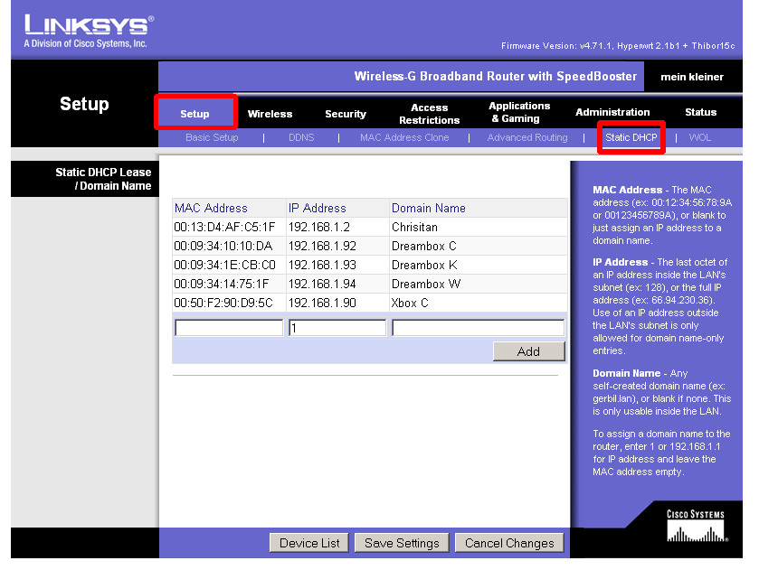 Ich habe mir unlängst einen Linksys WRT54GL zugelegt. Das "Problem", das ich nun habe ist folgendes: ich finde die Option nicht (oder sie existiert schlicht nicht) mit der ich die IP adressen basierend auf der angeschlossenen MAC Adresse vergeben kann bitte um Hilfe lg, Athropos