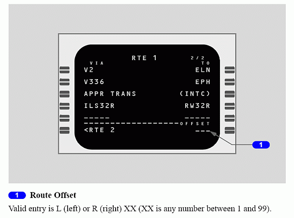der Offset wird z. B. "R02" (für 2NM rechts von der LNAV Route) eingegeben. ![]() Die Informationen zum T/D erscheinen erst 200NM vor dem T/D auf den FMC-Seiten.