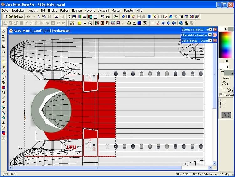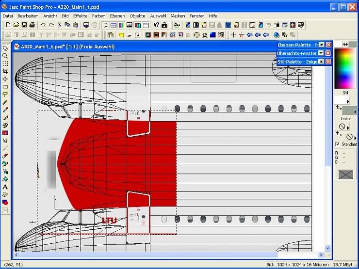 Nun ist es aber so daß Die Main-Texturen bei beiden Fällen die A320 Texture ist, es gibt demnach keine spezielle A321 Main-Texture. Hier ein Bild von einem LTU A320, man kann sehr schön den weißen Streifen zwischen Window und dem Roten Dach sehen: http://www.airliners.net/open.file/1222448/M/ Um nun das auch beim Modell hinzubekommen, was vielleicht etwas schwierig werden könnte, ist meineserachtens so vorzugehen: A321 LTU Livery die man downloaden kann (Ausschnitt): ![]() Im roten sieht man den GMax Modell Rahmen von der Dachpartie Hier sollte nun der erste Abschnitt weiß gemacht werden: ![]()